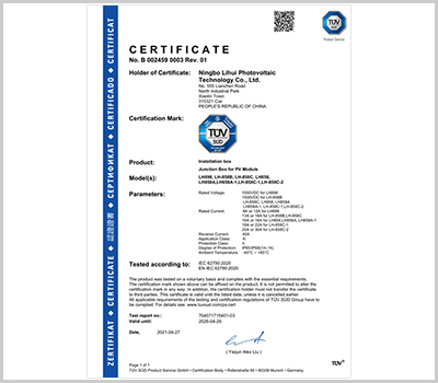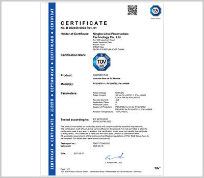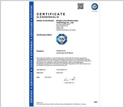麗輝光伏通過多年的努力和發展,秉承以人為本、質量優先、客戶至上的生產銷售理念,已經形成多種系列光伏接線盒、光伏連接器的專業生產制造商,我們產品具備:品種多、設計新穎、市場覆蓋區域性廣等特征,產品備受廣大客戶所青睞,目前本公司產品主要銷往中國各地、德國、意大利、瑞士、西班牙、墨西哥、泰國、越南、印度、土耳其、澳大利亞等國家和地區。麗輝光伏結合10多年連接器生產管理的經驗,企業通過了ISO9001等體系認證,同時我們擁有標準現代化廠房,并配備各種自動化生產設備、先進檢測設備,依托多個知名的認證服務商,產品通過TUV等認證,目前我們接線盒日產量達到9萬套。我們將會站在市場需求的前沿,為太陽能光伏事業、為綠色可再生能源、為減少碳排放而不斷地努力!
